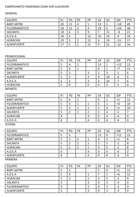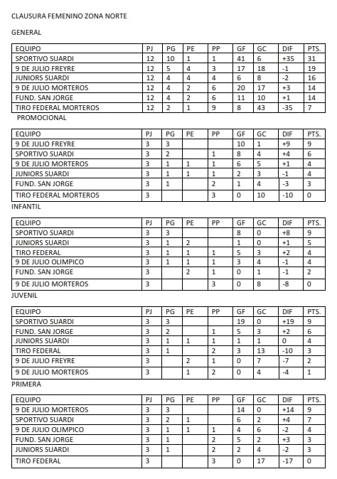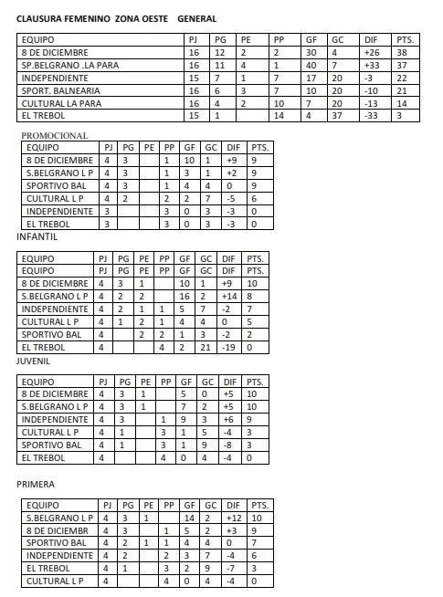 TABLAS GENERALES DE FUTBOL FEMENINO